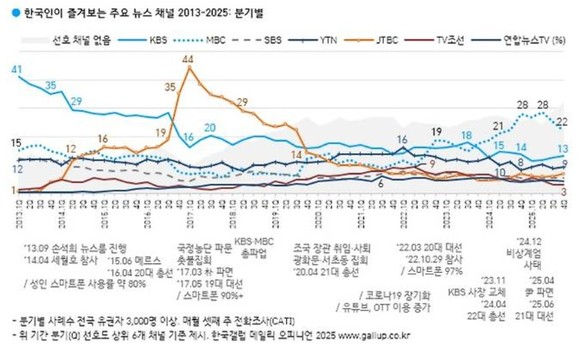 ‘KBS’ 선호도는 지난 2018년 4분기(20%) 이후 20%대를 회복하지 못하고 있는 가운데 특히 지난 2024년부터는 10% 후반대에도 미치지 못하고 있다. 이에 한국갤럽은 “KBS는 2023년 들어 정부의 수신료 분리 징수 시행, 신임 사장 임명, 일부 프로그램 전격 개편·폐지 등 격랑을 겪었다”며 “지난해 1분기 선호도 최저치(11%)를 기록했다”고 밝혔다.