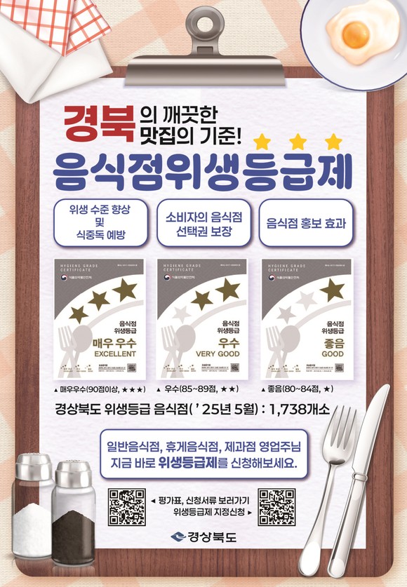 경북 영주시보건소는 시민이 안심하고 외식할 수 있는 환경을 조성하기 위해 음식점 위생등급제 참여 업소를 연중 상시 모집하며, 위생 관리 수준 향상에 힘쓰고 있다.