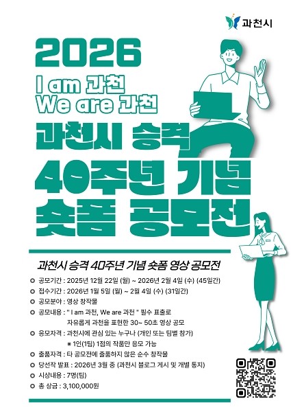 과천시는 시 승격 40주년을 맞아 ‘숏폼 영상 공모전’을 개최하고, 오는 2월 4일까지 작품을 모집한다고 밝혔다.