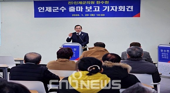 한수현 부위원장은 20일 인제군사회적경제지원센터에서 '인제군수 출마 보고 기자회견'을 열고 더불어민주당 군수 후보로 출마하겠다고 밝혔다.