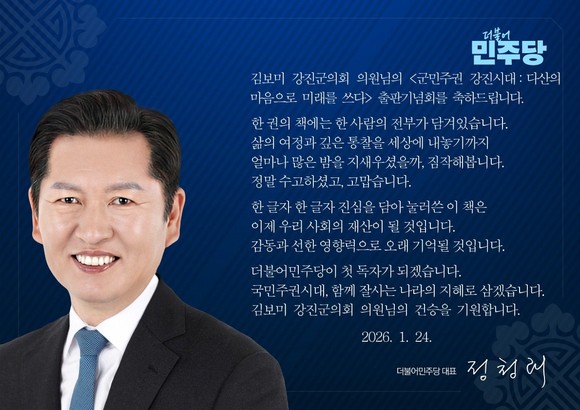 김 의원은 오는 24일(토) 오후 2시, 강진아트홀 대공연장에서 저서『군민주권 강진시대 – 다산의 마음으로 미래를 쓰다』 출판기념회를 개최한다. 이번 행사는 전국 각지에서 보내온 축전과 영상 메시지를 통해, 강진의 변화와 혁신을 향한 비전을 공식적으로 선포하는 자리가 될 전망이다.