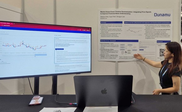 박희수 두나무 머신러닝팀 연구원은 AAAI 데모트랙에서 ‘시장 반응형 이벤트 타임라인 요약: 가격 신호 통합을 통한 금융 뉴스 이해도 향상’ 논문을 발표하고, 두나무가 자체 개발한 시스템을 직접 시연했다. 해당 연구는 뉴스 데이터와 디지털자산 시세 차트의 변동 데이터를 결합해 시세 변화의 원인이 된 핵심 뉴스만을 선별해 제공하는 시스템이다.