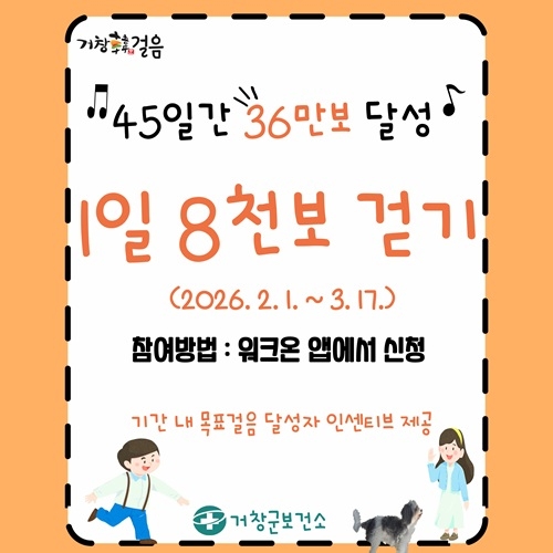 경남 거창군이 오는 2월 1일부터 3월 17일까지 거창군민을 대상으로 신체활동 증진과 생활 속 걷기 실천 활성화를 위해 '거창韓걸음' 1차 챌린지를 운영한다.