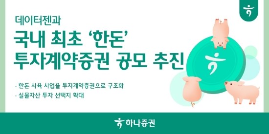 하나증권이 데이터젠과 함께 국산 돼지(한돈)를 기초자산으로 한 ‘가축투자계약증권 제1호’ 공모를 추진한다고 29일 밝혔다.