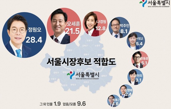 또한 여야 포함 전체 후보들에 대한 다자 대결 조사에서도 민주당 정 구청장이 28.4%로 가장 높은 지지세를 보였으며, 그 뒤를 국민의힘 오 시장이 21.5%, 같은 당 나경원 의원 12.8%, 민주당 박주민 의원 8.1%, 같은 당 서영교 의원 5.4%, 국민의힘 한동훈 전 대표 5.1%, 민주당 전현희 의원 3.1%, 같은 당 김영배 의원 2.4%, 박홍근 의원 1.6% 순이었으며, ‘그 외 인물’은 1.9%, ‘없음’ 4.8%, ‘잘 모름’ 4.8로 나타났다.