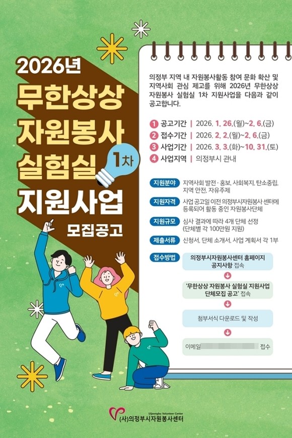 의정부시자원봉사센터가 지역 자원봉사단체의 프로그램 운영비를 지원하는 ‘2026년 무한상상 자원봉사 실험실’ 1차 지원사업 공모를 진행한다. 센터는 자원봉사 참여 문화를 넓히고 지역사회 문제 해결을 돕는 아이디어를 발굴한다는 계획이다.