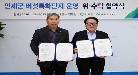 인제군(군수 최상기)과 인제군산림조합(조합장 전덕재)은 최근 군수 집무실에서 최상기 군수와 박상수 관광경제국장, 전덕재 산림조합장 등이 참석한 가운데 버섯특화단지 운영 업무협약을 체결했다. 협약에 따라 군은 버섯특화단지 운영 사무를 인제군산림조합에 위탁하고 산림조합은 단지의 체계적인 운영·관리와 사업 활성화를 담당한다.