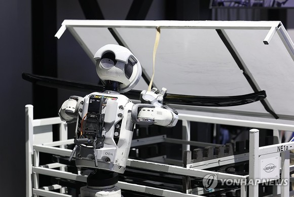 현대차가 개발한 로봇 '아틀라스'가 자동차 부품 이동을 시연하고 있다.(사진=연합뉴스)