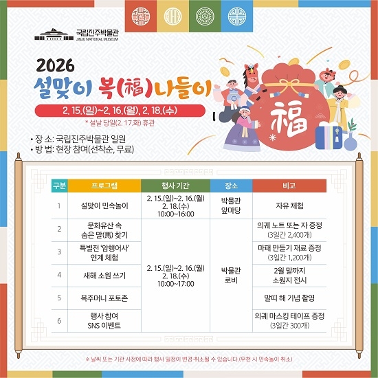 국립진주박물관은 2026년 병오년(丙午年) 설을 맞이해 오는 15일, 16일, 18일 3일간 박물관 일원에서 ‘2026 설맞이 복(福) 나들이’ 행사를 개최한다고 3일 밝혔다.