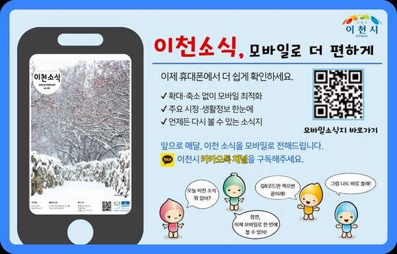 한편 이천소식지 모바일판은 도메인 주소나 이천시청 누리집과 공식 사회관계망서비스(SNS), 그리고 종이 소식지에 삽입된 큐알(QR)코드를 통해 누구나 무료로 열람할 수 있다.