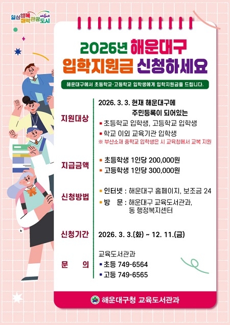 신청 기간은 3월 3일부터 12월 11일까지이며, 해운대구 홈페이지와 ‘보조금24’를 통한 온라인 신청은 물론 동 행정복지센터와 구 교육도서관 방문 신청도 가능하다.