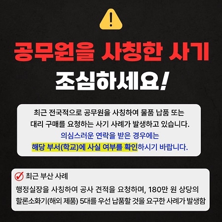 시교육청 관계자는 “학교나 교육청은 어떠한 경우에도 업체에 물품 대리 구매를 요구하거나 개인 계좌로 대금 송금을 유도하지 않는다”며 “학교 관계자라고 주장하는 연락을 받더라도 반드시 기관의 공식 전화번호를 통해 사실 여부를 재확인해 달라”고 당부했다.