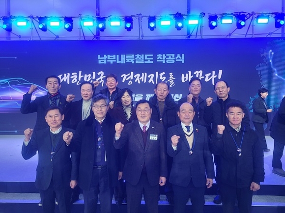 지난 6일 거제 아그네스파크에서 남부내륙철도 착공식이 열린 가운데 김윤철 군수를 비롯한 합천군 관계자들이 기념촬영을 하고 있다. (사진=합천군 제공)