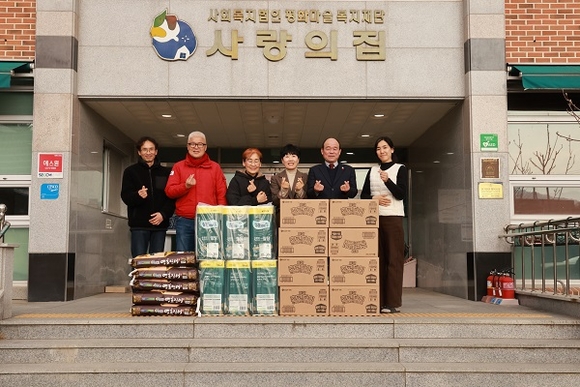 정봉훈 의장 등 합천군의회 관계자들이 관내 사회복지법인 사랑의집을 방문해 위문품을 전달한 뒤 기념촬영을 하고 있다. (사진=군의회 제공)