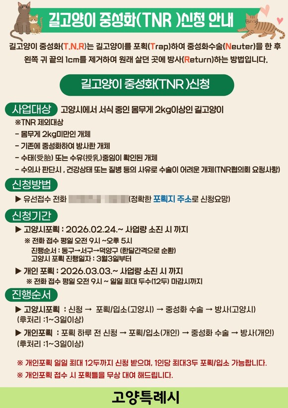 대상은 고양시에 서식하는 2kg 이상 길고양이다. 신청은 고양시 반려온뜰(TNR 전용번호)에서 접수한다. 고양시포획은 오는 24일 오전 9시부터, 개인포획은 3월 3일 오전 9시부터 신청을 받는다. 개인포획은 하루 최대 12마리까지 접수되며, 1인당 3마리로 제한된다.