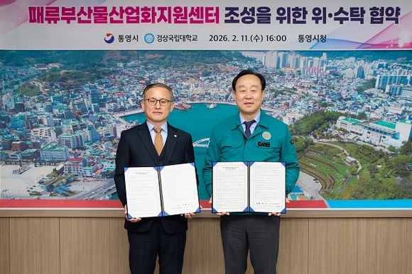 경상국립대학교와 통영시는 지난 11일 통영시 시장실에서 굴·가리비·전복 등 패류부산물을 체계적으로 처리하고 이를 고부가가치 상품으로 개발하기 위해 ‘패류부산물 산업화 지원센터’ 조성 업무협약을 체결했다고 13일 밝혔다.