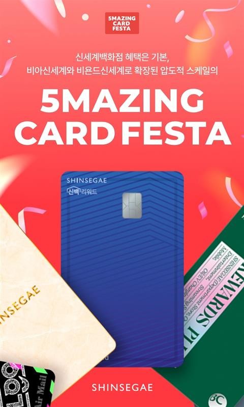 신세계백화점이 다음 달 2일까지 씨티·삼성·신한·하나·BC바로카드 등 5개 제휴카드사와 '5메이징 카드 페스타'를 열고 풍성한 쇼핑 혜택을 선사한다고 19일 밝혔다.