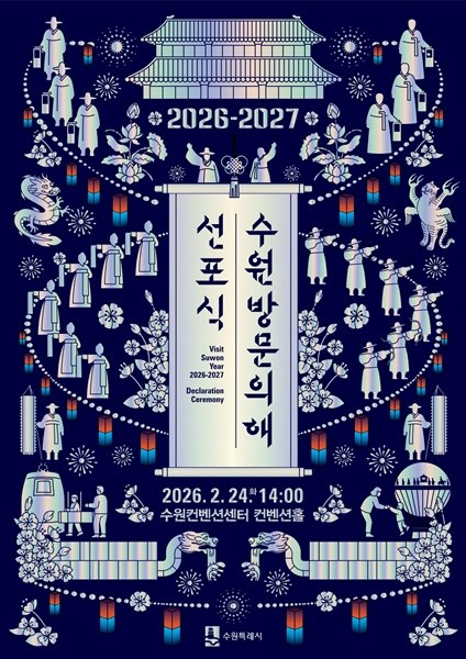 ‘2026-2027 수원 방문의 해’ 선포식이 오는 24일 오후 2시 수원컨벤션센터 컨벤션홀에서 열린다. 선포식은 수원 방문의 해 로고 기수단 입장으로 시작된다. 이재준 수원시장과 산하기관·관광업계·시민단체 대표 30명이 기수로 참여한다.