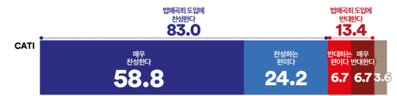 ‘찬성한다’(‘매우 찬성’ 58.8% + ‘찬성하는 편’ 24.2%)가 83.0%나 됐다. 특히 ‘매우 찬성한다’가 60%에 육박해 찬성률이 극히 높았다.
