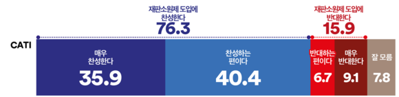 이어 법원의 선고 결과가 헌법 또는 법률에 어긋난다고 판단될 경우 국민이 직접 헌법재판소에 위반 여부를 밝혀달라고 청구하도록 하는 ‘재판소원제’ 도입에 대해서도 찬성 응답이 76.3%나 됐다.