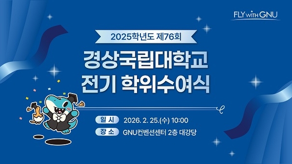 경상국립대학교는 오는 25일 오전 10시 가좌캠퍼스 GNU컨벤션센터에서 ‘2025학년도 전기(제76회) 학위수여식’을 열고 박사·석사·학사 학위 취득자들의 새로운 출발을 축하한다고 23일 밝혔다.