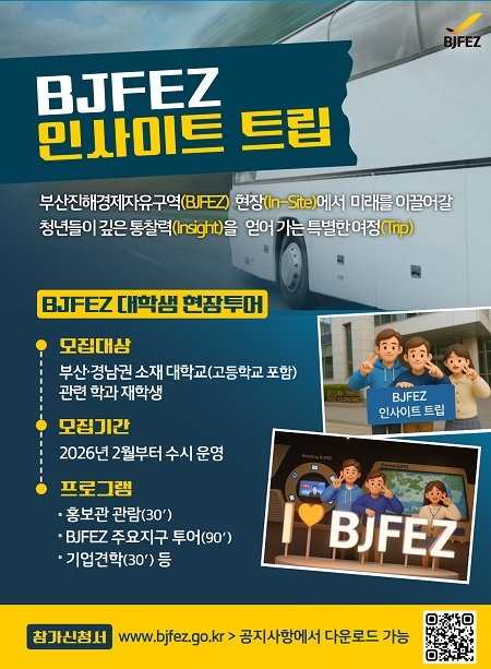 부산진해경제자유구역청이 지역 청년들에게 첨단 산업 현장을 직접 체험할 기회를 제공하는 ‘2026년 상반기 BJFEZ 인사이트 트립’ 참여 대학(학과)과 대학생을 2월 중 모집한다.