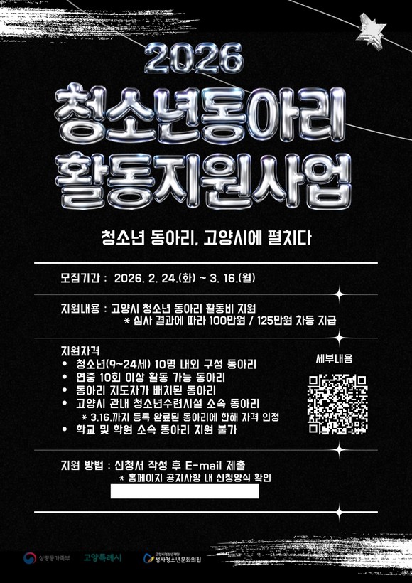 고양시청소년재단 성사청소년문화의집이 ‘2026년 고양시 청소년동아리 활동지원사업’에 참여할 청소년동아리를 내달 16일까지 모집한다. 선정 규모는 20개 내외로, 심사 결과에 따라, 팀당 100만 원 또는 125만 원의 활동비가 지원된다.