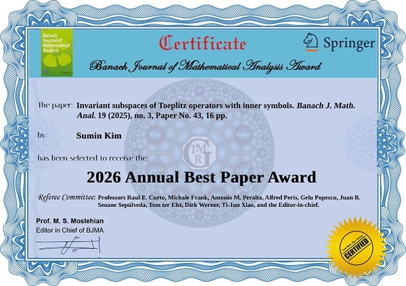 Banach Journal of Mathematical Analysis는 해석학 분야에서 높은 평가를 받는 SCI 등재 국제학술지로, 최근 2년간 게재된 논문을 대상으로 매년 단 1편의 최고 논문을 선정해 Best Paper Award를 수여한다. 2026년 수상 논문은 2024~2025년에 게재된 총 153편 가운데 최종 선정됐으며, 세계 각국의 석학들로 구성된 편집위원회(Editor-in-Chief 포함)의 엄정한 심사를 거쳐 결정됐다.