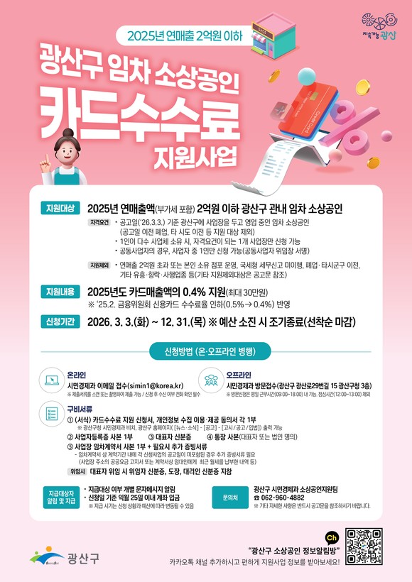지원 대상은 지난해 연 매출액(부가세 포함) 2억 원 이하의 광산구 내 임차 소상공인을 대상으로 지난해 카드 매출액의 0.4%로 최대 30만 원까지 지원한다.