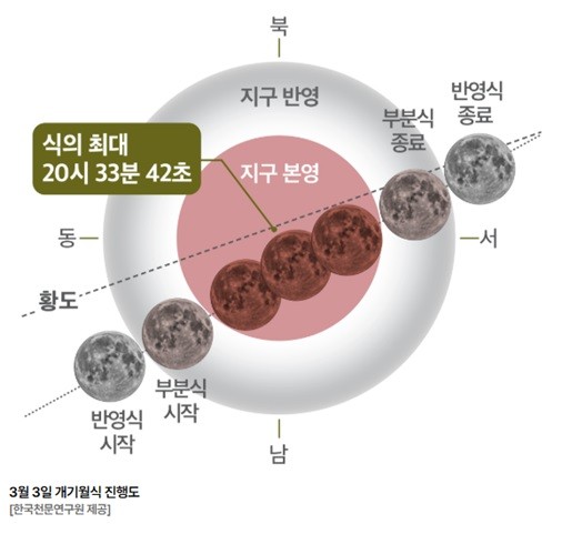 월식은 이날 18시 49분에 달이 지구 본그림자에 부분적으로 가려지는 부분식이 시작되며 본격적인 진행에 들어간다. 이어 20시 4분부터 달이 지구 그림자에 완전히 들어가는 개기식은 시작되고, 20시 33분에 최대에 이른 뒤 21시 3분에 종료된다. 이후 부분식이 다시 이어져 23시 24분에 월식의 전 과정이 마무리될 예정이다.