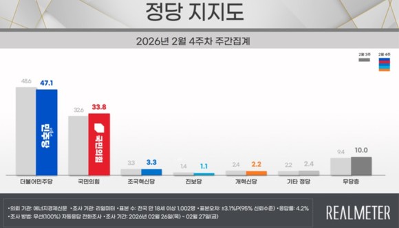 여론조사 전문기관 <리얼미터>가 <에너지경제신문>의 의뢰로 지난 23일부터 27일까지 5일간 전국 18세 이상 남녀 유권자 2507명을 대상으로 실시한 2월 4주차 주간 여론조사에서 ‘이재명 대통령의 국정 수행에 대해 어떻게 평가하는가?’라는 질문에 ‘잘하고 있다’는 긍정 평가는 전주 대비 1.1%p 하락한 57.1%(‘매우 잘함’ 45.6%, ‘잘하는 편’ 11.5%), 반면, ‘잘못하고 있다’는 부정 평가는 1.0%p 상승한 38.2%(‘매우 잘못함’ 29.2%, ‘잘못하는 편’ 9.0%)로 긍·부정 격차가 21.0%p에서 18.9%p로 축소됐고, ‘잘 모르겠다’는 4.7%로 나타났다.