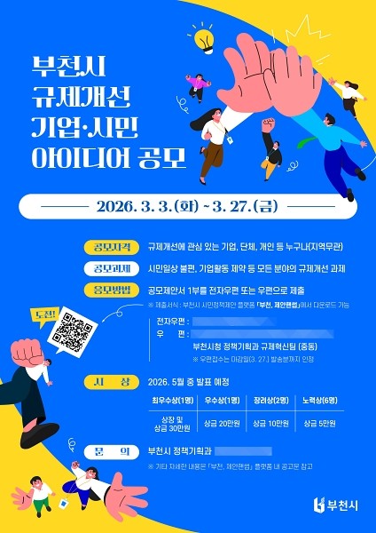 이성동 부천시 정책기획과장은 “이번 공모는 시민과 기업의 작은 제안이 행정의 변화를 이끄는 출발점이 될 것”이라며 “현장의 목소리가 규제혁신으로 이어질 수 있도록 적극 참여해 달라”고 말했다.
