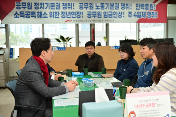김 예비후보는 지부장 김무윤 씨 등과 면담에서 “공무원의 고충을 누구보다 잘 아는 동료”라며 “줄서기·밀실 인사를 끝내고 일하는 공무원이 보호받는 조직을 만들겠다”고 강조했다.