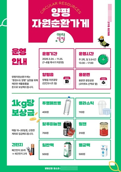 ‘양평 자원순환가게’는 투명 페트병, 캔, 종이팩 등 재활용 가능 자원을 주민이 직접 가져와 품목별로 올바르게 분리·배출하면 현금 또는 종량제 봉투 등으로 보상하는 사업이다. 양평군은 이를 통해 일상생활 속 자원순환 실천 문화를 확산할 계획이다.