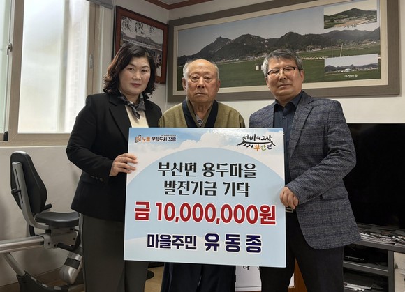 장흥군 부산면은 지난 3일 용두마을회관에서 유동종(90) 어르신의 마을 발전기금 1천만 원 기탁식을 가졌다고 밝혔다.