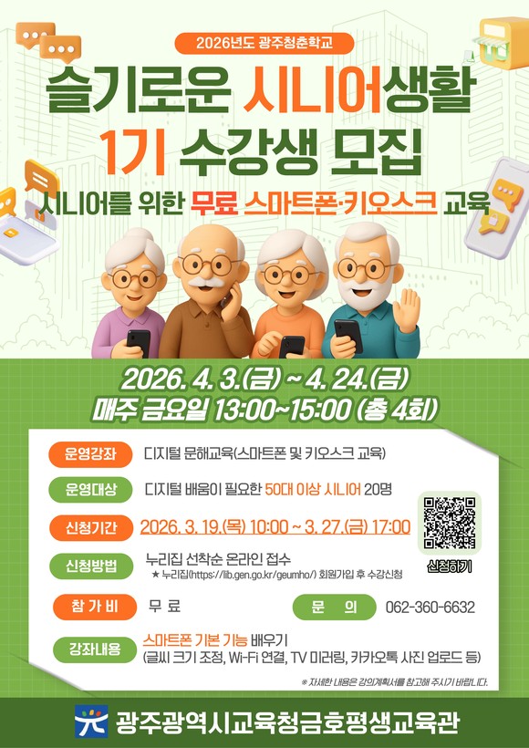 광주시교육청금호평생교육관(이하 금호평생교육관)은 오는 4월 3일부터 7월 31일까지 50대 이상 시니어를 대상으로 디지털 역량 강화 프로그램인 ‘2026 슬기로운 시니어생활’을 운영한다.