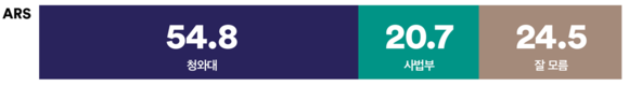 청와대와 사법부 중 어디를 더 신뢰하냐는 설문에 54.8%가 청와대를 선택해 사법부의 20.7%를 2.6배로 압도했다.