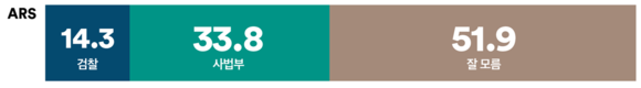 검찰에 대한 신뢰도는 처참한 수준이었다. 검찰과 사법부 중 어디를 더 신뢰하냐는 설문에 검찰이라는 응답은 14.3%에 불과해, 사법부의 33.8% 절반에도 못 미쳤다.