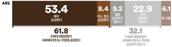 한편, 이 조사는 ‘사법 신뢰를 회복하기 위해 조희대 대법원장이 사퇴해야 한다는 주장에 대한 공감’ 여부도 물었는데 ‘공감한다’(‘매우 공감’ 53.4% + ‘어느 정도 공감’ 8.4%)가 61.8%로 ‘공감하지 않는다’(‘별로 공감하지 않는다’ 9.2% + ‘전혀 공감하지 않는다’ 22.9%)는 32.1%보다 훨씬 많았다. 두 응답 간 격차는 29.7%p였다.