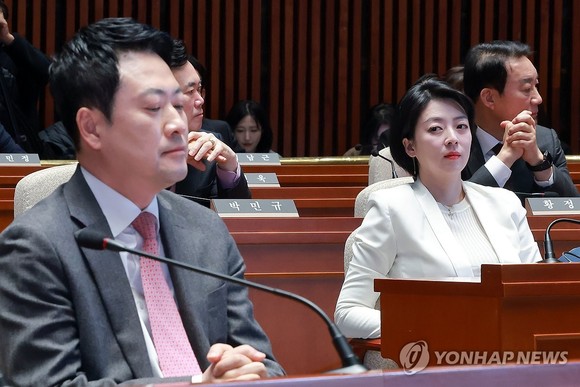 국민의힘 장동혁 대표가 9일 국회에서 열린 의원총회에 참석해 송언석 원내대표 발언을 듣고 있다. 장 대표 오른쪽은 서울시당위원장인 배현진 의원. (사진=연합뉴스)
