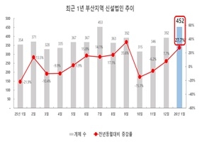 부산상공회의소는 10일 ‘2026년 1월 부산지역 신설법인 현황 조사’ 결과를 발표하고 지난 1월 부산지역 신설법인이 452개로 전년 동월 대비 27.7% 증가했다고 밝혔다. 지난해 10월 315개로 최근 1년 사이 최저치를 기록한 이후 11월부터 3개월 연속 증가세를 이어간 것이다.