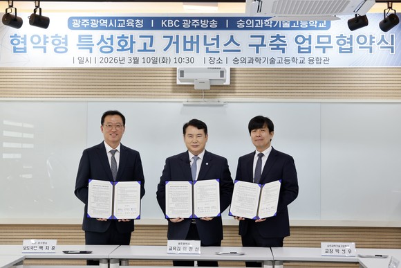 광주시교육청(교육감 이정선)은 10일 숭의과학기술고등학교에서 KBC광주방송, 숭의과학기술고등학교와 함께 ‘협약형 특성화고 거버넌스 구축 업무협약’을 체결했다.