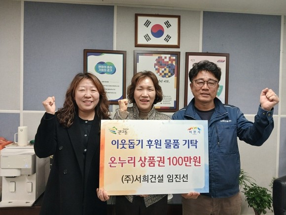 ㈜서희건설 임진선 대표는 지난 6일, 관고동 행정복지센터를 방문해 지역 내 어려운 이웃을 위해 사용해 달라며 온누리상품권 100만 원을 기탁했다.