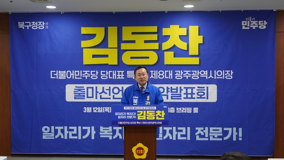 김동찬 북구청장 예비후보(더불어민주당)가 12일 광주시의회 브리핑룸에서 '최고의 복지는 일자리'라는 신념을 바탕으로 북구청장 선거 출마를 공식 선언했다.