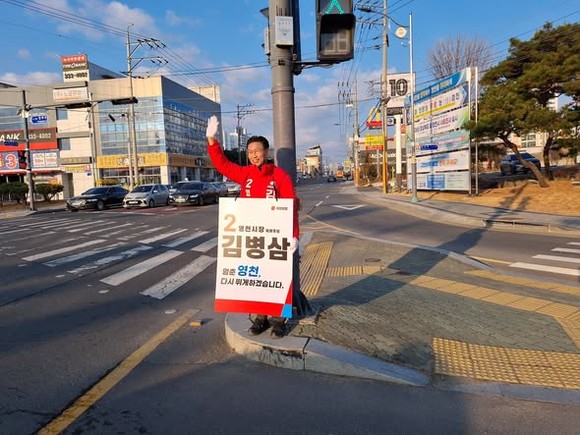 6·3 전국동시지방선거 영천시장 선거에 출마한 김병삼 전 영천부시장이 출근길 거리 인사에 나서며 시민들과 소통 행보를 이어가고 있다.