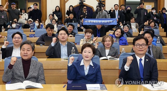 15일 국회 의원회관에서 열린 ‘뉴이재명을 논하다’ 토론회에서 민주당 이언주 최고위원(앞줄 가운데), 김영배 의원(왼쪽), 송영길 전 대표 등 참석자들이 파이팅을 외치고 있다. (사진=연합뉴스)