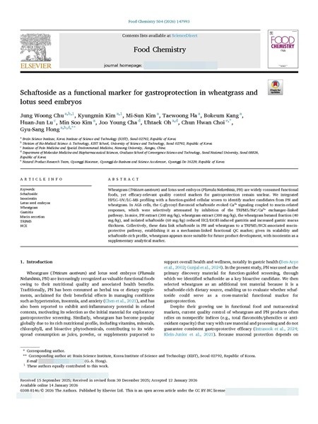 이번 연구 결과는 식품·영양 과학 분야 국제 학술지 푸드 케미스트리(Food Chemistry)에 게재됐다. 논문 제목은 ‘밀싹과 연자심에서 위 보호 기능을 나타내는 지표 성분으로서의 셰프토사이드’다. 푸드 케미스트리는 영양·식품과학 분야에서 영향력 있는 국제 학술지로, 관련 분야 상위 약 3.1% 수준에 들어가는 학술지다.