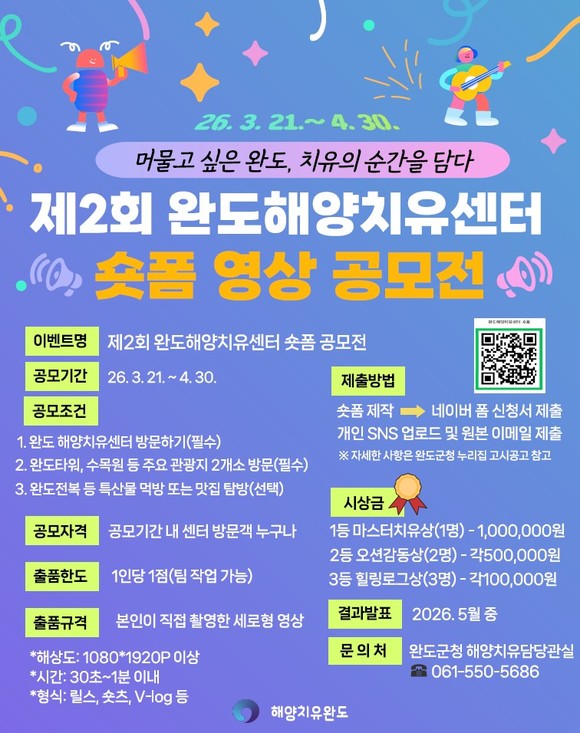 완도군은 완도해양치유센터에 대한 국민적 관심을 높이고 치유객 유입을 위해 ‘제2회 완도해양치유센터 숏폼 공모전’을 개최한다.