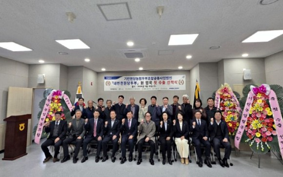 인제 기린원당농협두부조합공동사업법인은 18일 기린원당농협두부 조합공동사업법인 유통센터에서 최상기 군수, 이춘만 군의장, 엄윤순 도의회농림수산위원장, 박진호 농협 인제군지부장, 정종옥 기린농협장, 유병일 기린원당농협두부 조합공동사업법인 대표 등이 참석한 가운데 '내린천 원당두부 대 영국 첫 수출 선적식'을 진행했다.