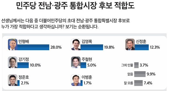 여론조사 전문기관 <미디어토마토>가 <뉴스토마토>의 의뢰로 지난 16일~17일까지 이틀 동안 만 18세 이상 ‘전남·광주 통합특별시’ 거주 성인남녀 유권자 1012명을 대상으로 ‘민주당의 초대 전남·광주 통합시장 후보로 누가 가장 적합하다고 생각하는가?’라는 질문에 전체 응답자의 28.0%가 민 의원을 꼽았다.